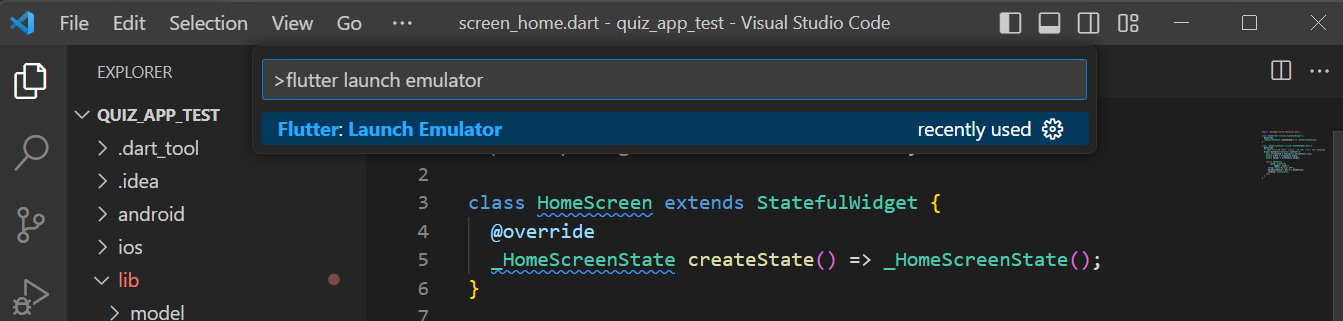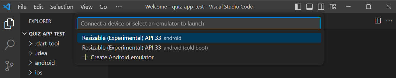 - F1 ๋๋ Ctrl + Shift + P ๋๋ฌ์ Flutter: Launch Emulator ๊ฒ์ > Enter > ๋ด๊ฐ ๋ง๋ ADK ์ ํ > Enter