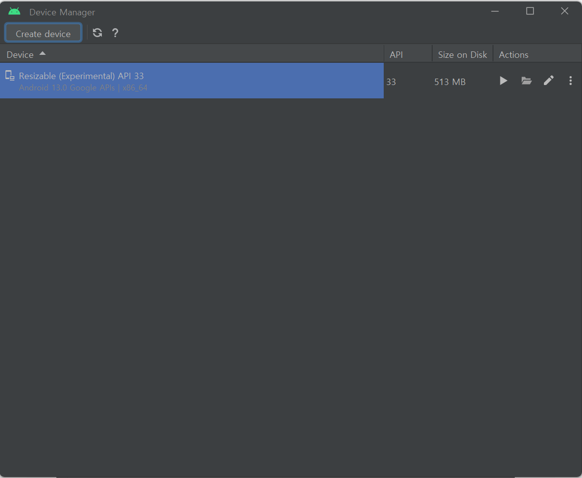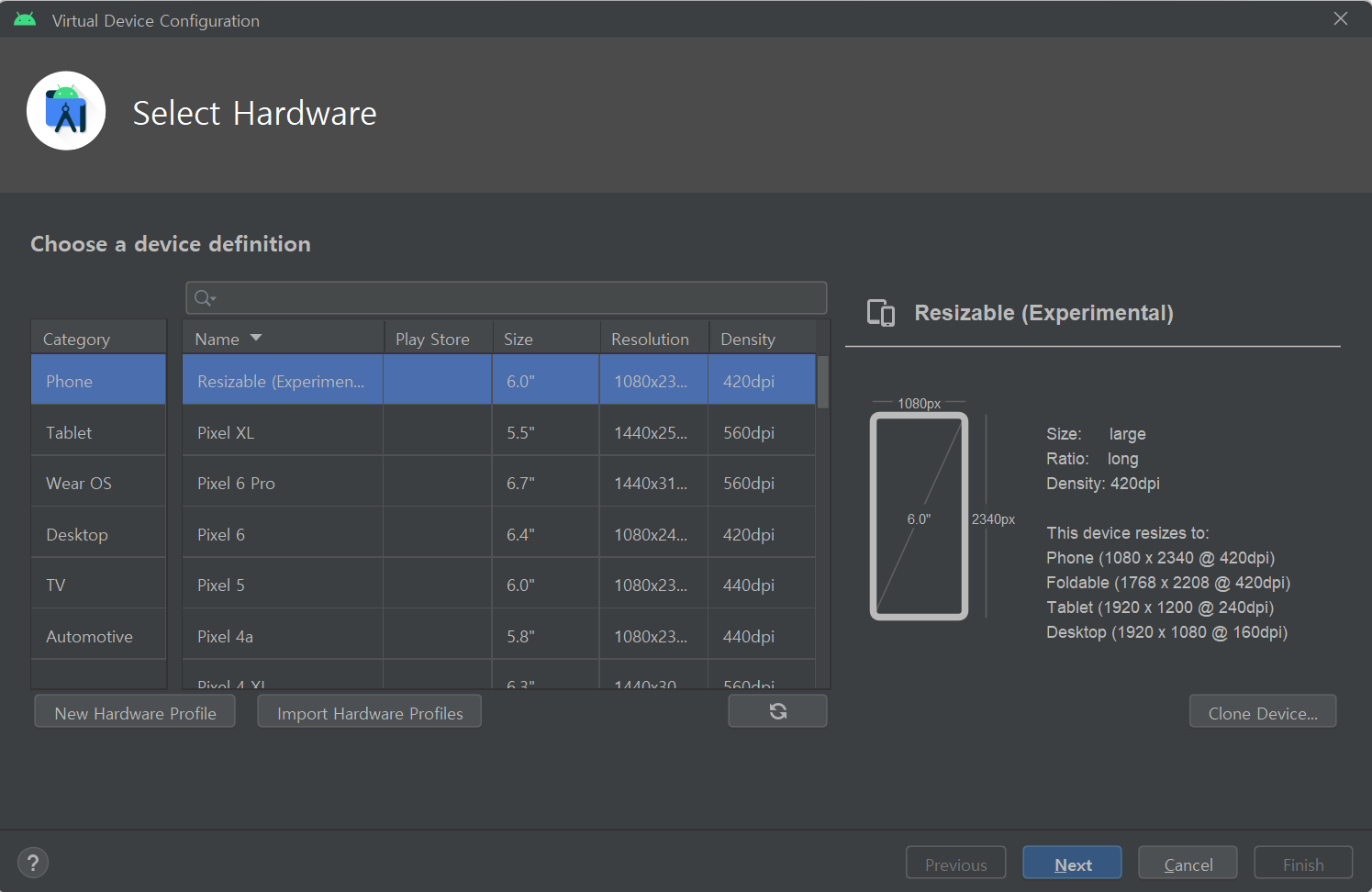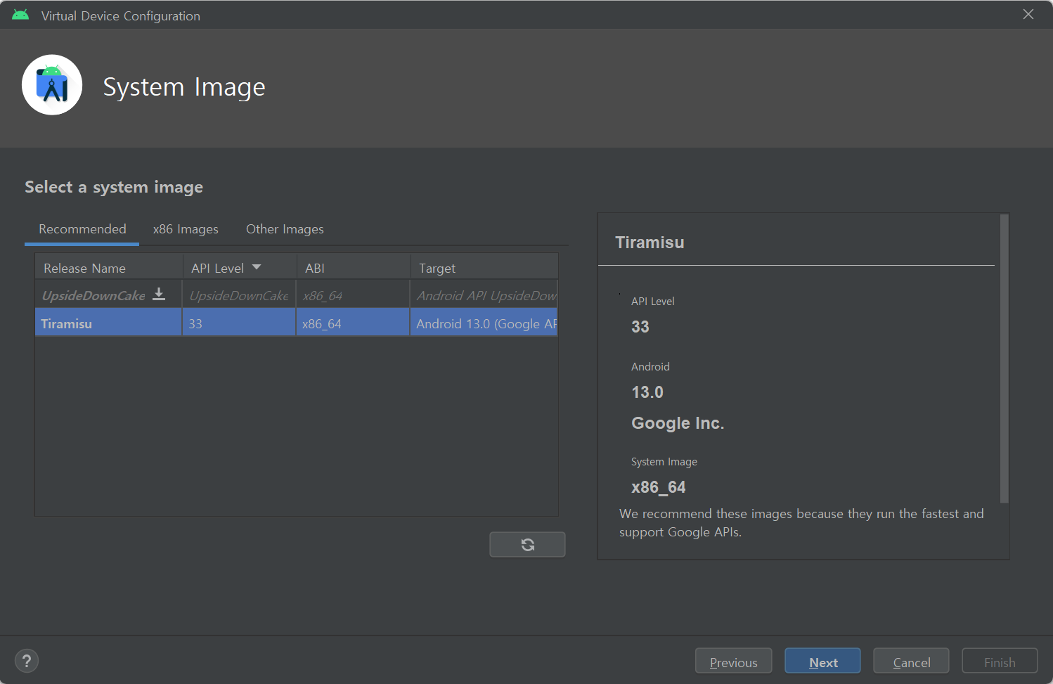 2. Create Device > ์ํ๋ ๊ธฐ๊ธฐ ์ ํ > Next > ์์คํ ์ด๋ฏธ์ง ์ ํ > Next > AVD ์ ์ฅ > Finish
