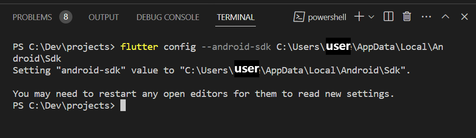 flutter config --android-sdk C:\Users\%USERNAME%\AppData\Local\Android\Sdk