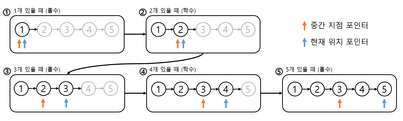 5. ์ง์์ผ ๋๋ ํฌ์ธํฐ๊ฐ ๊ฐ์ด ํ์นธ์ฉ ์์ง์ด๊ณ , ํ์์ผ ๋๋ ํ์ฌ ํฌ์ธํฐ ์์น๋ง ํ์นธ ์์ง์ธ๋ค
