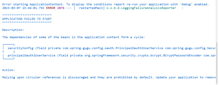 - SecurityConfig --> PrincipalOauth2UserService --> BCryptPasswordEncoder --> SecurityConfig ๊ฐ ๋์ด ์ํ ์ฐธ์กฐ ๋ฌธ์ ๊ฐ ๋ฐ์ํ๋ค.