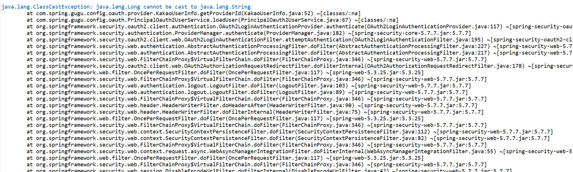๊ทธ๋์ ์นด์นด์ค ๋ก๊ทธ์ธ ๊ฐ์ ๊ฒฝ์ฐ์๋ getProviderId()๋ฅผ ํ์ ๋ id๊ฐ ์ซ์๋ก ๋์ด ์๊ธฐ ๋๋ฌธ์ ์๋ฐ๊ฐ int๋ฅผ ๋ฐ๋ก String์ผ๋ก ์บ์คํ ํ ์ ์์ด ClassCastException ์๋ฌ๋ฅผ ๋ธ ๊ฒ์ด๋ค.