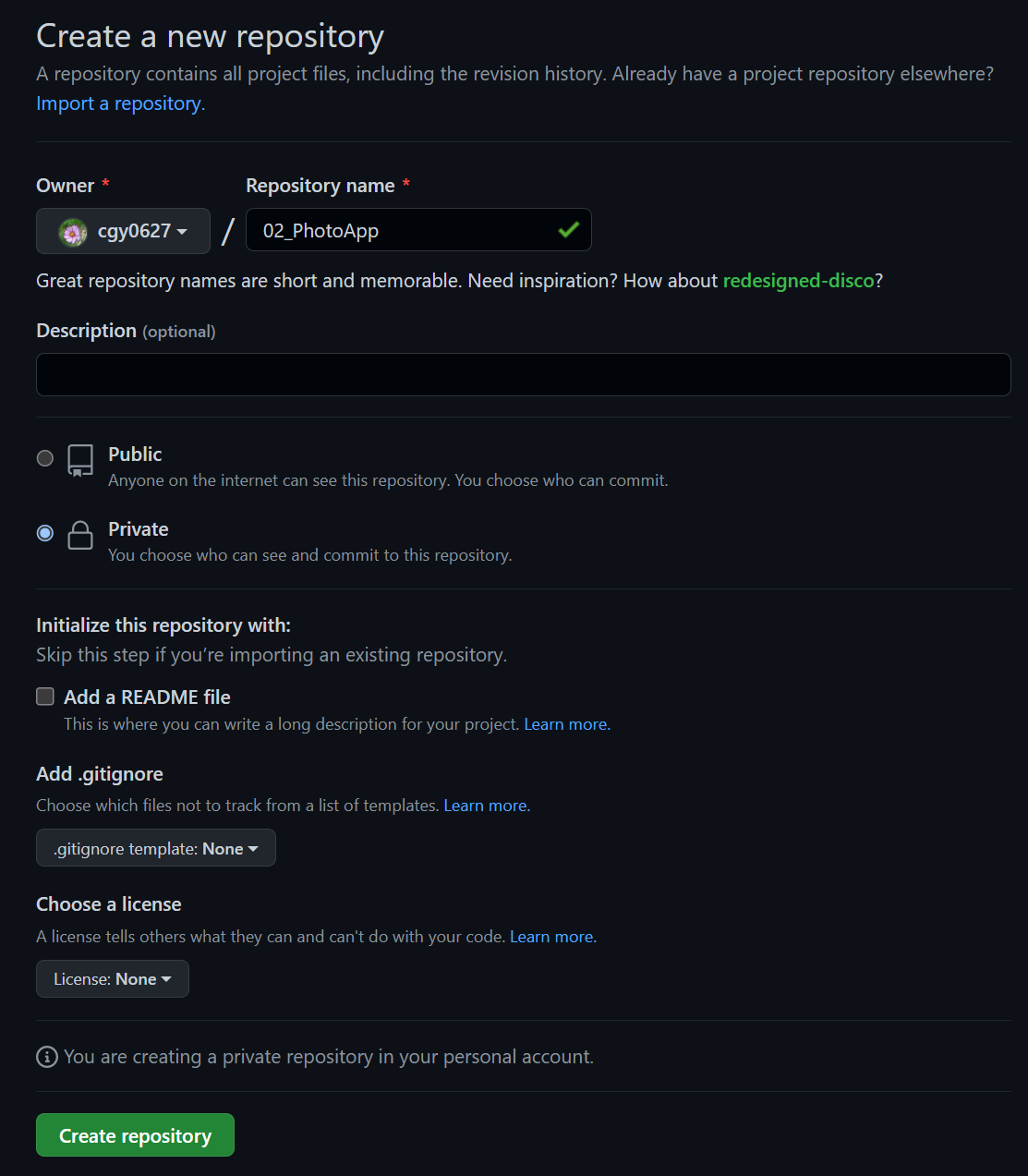 1. GitHub์์ ์๋ก์ด ๋ ํฌ์งํ ๋ฆฌ ๋ง๋ค๊ธฐ (Respositories > New > Create repository)
