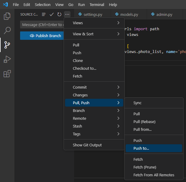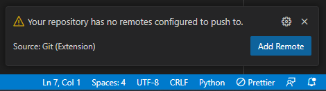 5. ์ปค๋ฐ์ด ๋๋๋ฉด “…” ๋ฒํผ ๋๋ฅด๊ธฐ > Pull, Push > Push to… > Add Remote > 1๋ฒ์์ ๋ง๋ ๋ ํฌ์งํ ๋ฆฌ ์ฃผ์ ๋ณต๋ถ > Enter > Remote name ์ฐ๊ธฐ > Enter