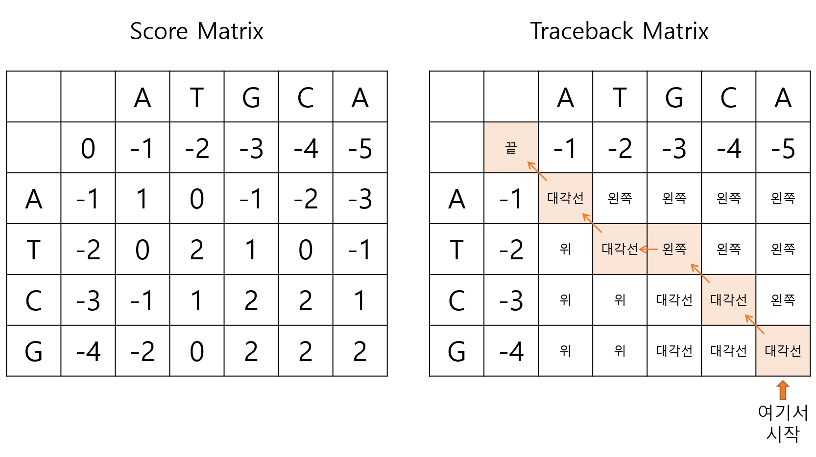 ์์ ๊ฐ์ด ๋ชจ๋ ์์๋ฅผ ์ฑ์ด ํ์ Traceback Matrix๋ฅผ ์ด์ฉํด์ ๊ฐ์ฅ ์ค๋ฅธ์ชฝ ์๋ ์นธ์์๋ถํฐ "๋"์ด๋ผ๊ณ ํ๊ธฐ๋์ด ์๋ ๊ณณ๊น์ง ๊ฑฐ์ฌ๋ฌ ์ฌ๋ผ๊ฐ๋ค.