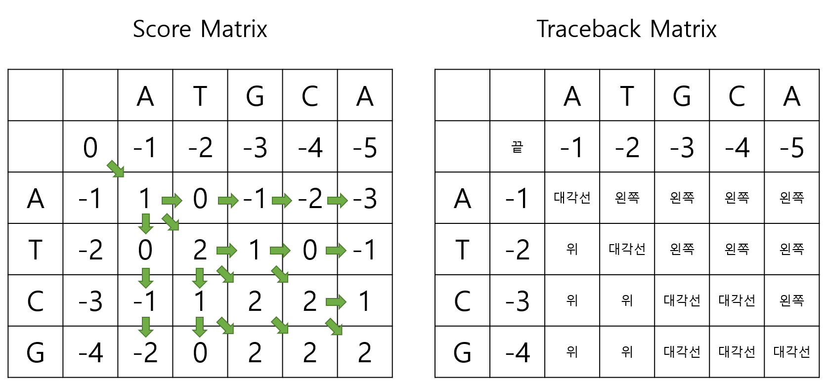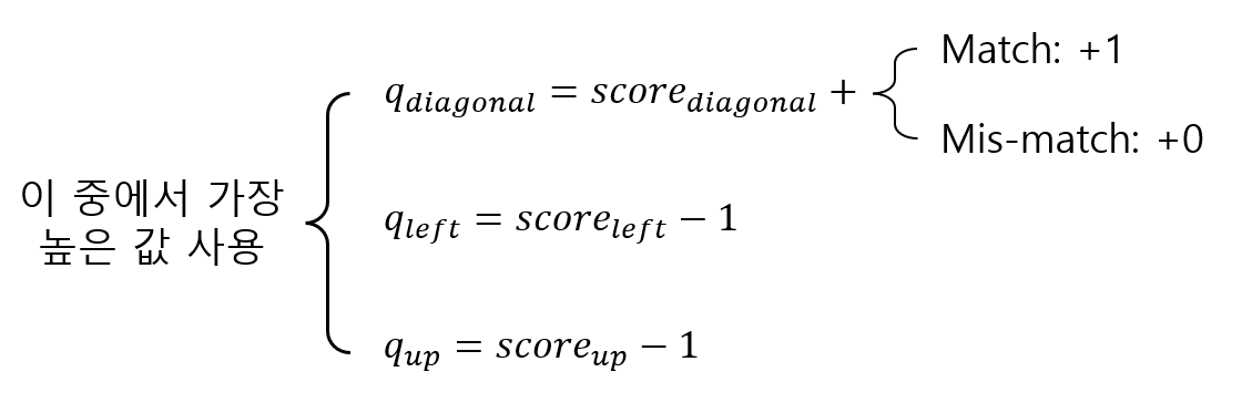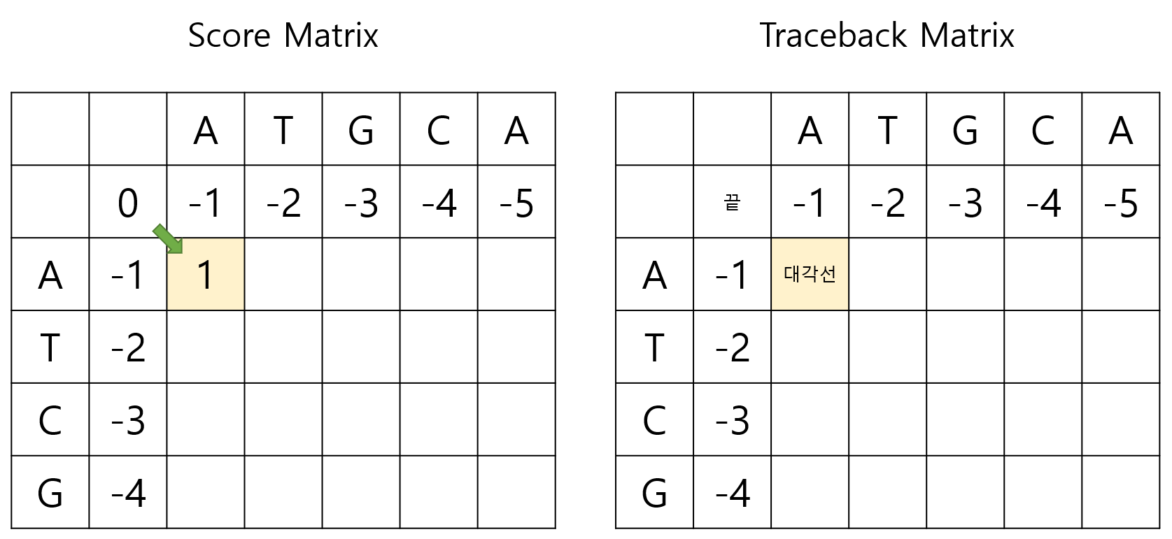 ์ด ์ค์์ ๊ฐ์ฅ ๋์ ๊ฐ์ ์ฌ์ฉํด์ผํ๊ธฐ ๋๋ฌธ์ 1๋ก ์ฑ์๋ฃ์ผ๋ฉด ๋๋ค. ๊ทธ๋ฆฌ๊ณ 1์ ๋๊ฐ์ ์ผ๋ก๋ถํฐ ๊ณ์ฐ๋์๊ธฐ ๋๋ฌธ์ Traceback Matrix์๋ ๋๊ฐ์ ์ด๋ผ ํ๊ธฐ๋ฅผ ํ๋ค.
