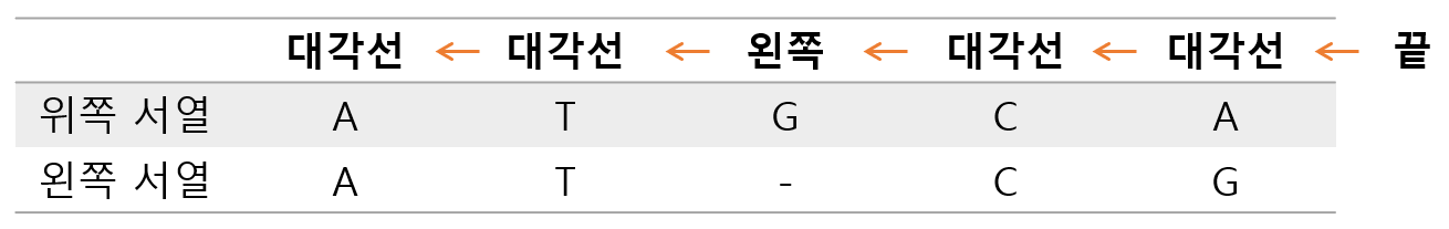 Traceback Matrix๋ฅผ ๋ณด๋ฉด ๋๊ฐ์ -> ๋๊ฐ์ -> ์ผ์ชฝ -> ๋๊ฐ์ -> ๋๊ฐ์ -> ๋ ์์๋ก ์ด์ด์ง๊ฑธ ํ์ธํ ์ ์๋ค. ์ด๊ฒ์ ์ด์ ์ฐจ๋ก๋๋ก ๋ ์์ด์ ์ ์ฉ์ ํด์ผํ๋ค.