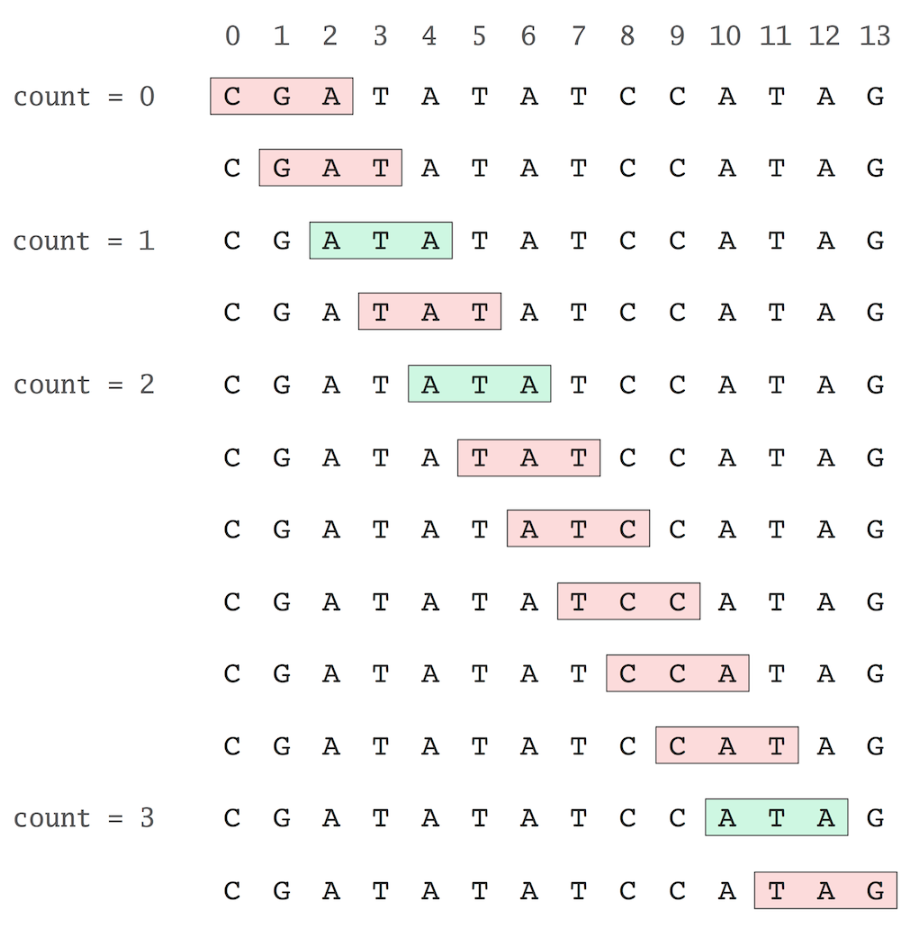 ์ฆ, ์ฐพ๊ณ ์ถ์ ํจํด์ ๊ธธ์ด์ธ k ๋งํผ ์ ์ฒด ๊ธธ์ด์์ ๋บ ํฌ์ง์ ๊น์ง์ k-mer๋ฅผ ํ์ธํ๋ฉด ๋๋ค.