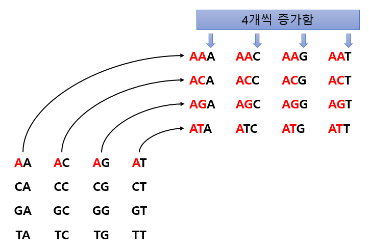 ์๋ ๊ทธ๋ฆผ์์ ์ฒ๋ผ DNA ์์ด์๋ A, C, G, T ๋ก ์ด 4๊ฐ์ง ์ผ๊ธฐ์์ด๋ง ๊ฐ๋ฅํ๊ธฐ ๋๋ฌธ์ ํญ์ 4๊ฐ์ฉ ๊ธธ์ด๊ฐ ์ฆ๊ฐํ๊ฒ ๋๋ค. ์ด ์๋ฆฌ๋ฅผ ์ด์ฉํด์ ์ ๋ถ๋ถ(๋นจ๊ฐ์ ํ์)์ ์ํ๋ฒณ ์์๋ง ์ฐจ๋ก๋๋ก ๊ณ์ฐํ๋ค ๋ณด๋ฉด ์ฃผ์ด์ง DNA ์์ด์ ์ต์ข ์์น๋ฅผ ์ ์ ์๋ค.